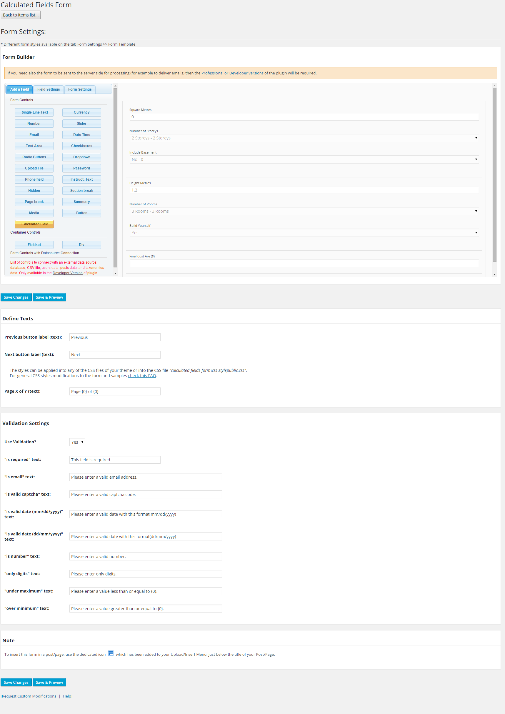 It includes a form builder for adding/editing different field types, including one or more automatically calculated fields based in the data entered in other fields.Calculated Fields Form can be used for creating both single and complex calculations, for example general calculators, ideal weight calculators, calorie calculators, calculate quotes for hotel booking and rent a car services, calculate quotes for appointments and services, loan & finance calculators, date calculators like pregnancy calculators, etc...