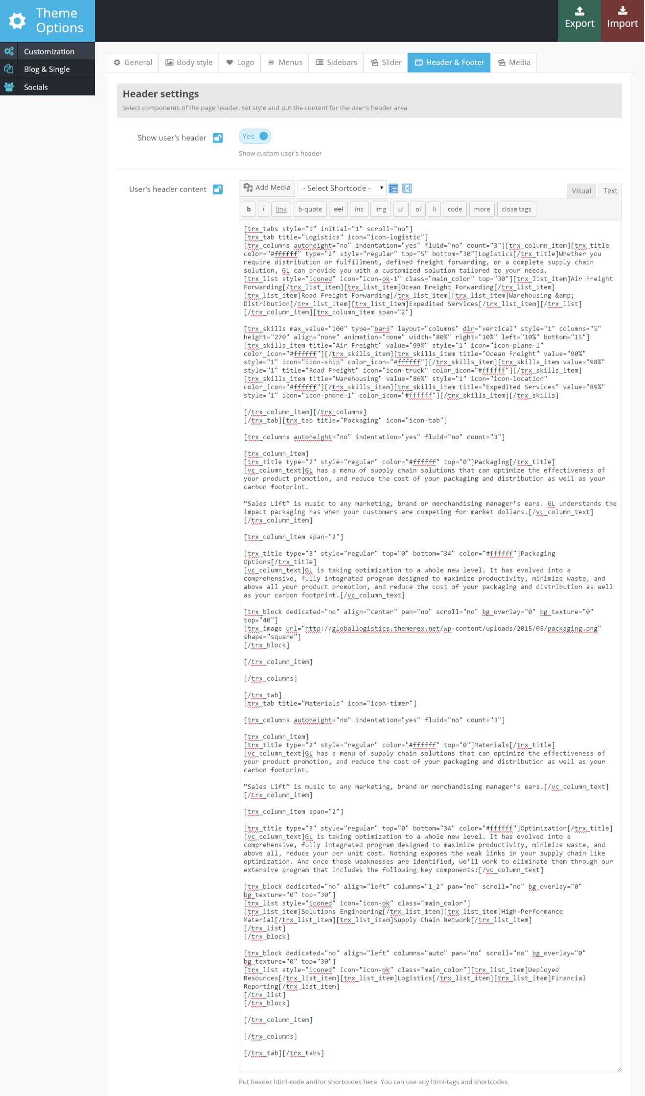 - Activate a different theme. Delete the previous version of Global Logistics and re-upload the new Wordpress Installable files that you have downloaded from Themeforest in the 1st step.