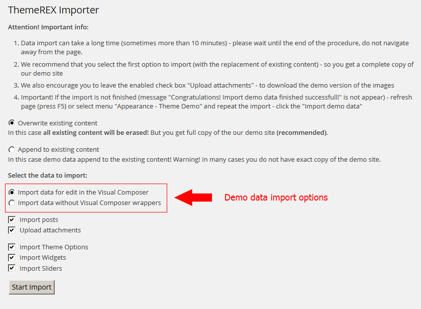 IMPORTANT: When installing demo-data ALL EXISTING CONTENTS of your website will be deleted and replaced with the new data! We highly recommend that you install demo data only on blank WordPress install.