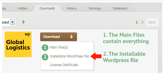 - Log into your Themeforest account and navigate to your downloads tab. Find the theme and download “Installable WordPress file”.